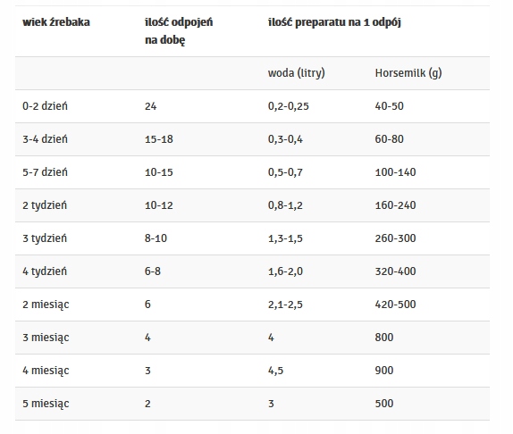 Poniższe zalecenia dotyczą całkowitego zastąpienia pokarmu klaczy. Podane ilości mogą być modyfikowane w zależności od stanu zdrowia, cech osobniczych i indywidualnego zapotrzebowania źrebaka.
