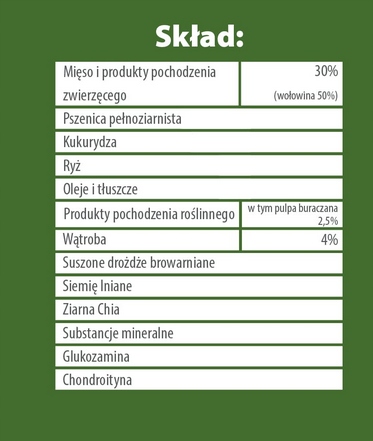 Skład: mięso i produkty pochodzenia zwierzęcego 30% (wołowina 50%), pszenica pełnoziarnista, kukurydza, ryż, oleje i tłuszcze,produkty pochodzenia roślinnego (w tym pulpa buraczana 2,5%), wątroba (4%),suszone drożdże browarniane, siemię lniane, ziarna Chia, substancje mineralne,glukozamina, chondroityna.