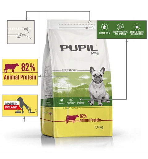 Najważniejsze cechy suchej karmy PUPIL PRIME QUALITY dla dorosłych psów ras małych i miniaturowych (<10 kg), bogatej w wołowinę z wątróbką 1,4 kg: