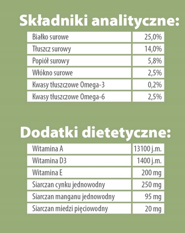 - Kwasy Omega-3 i Omega-6 korzystnie wpływają na wzrok, skórę i okrywę włosową zwierzęcia. Przeciwdziałają również chorobom krążenia.