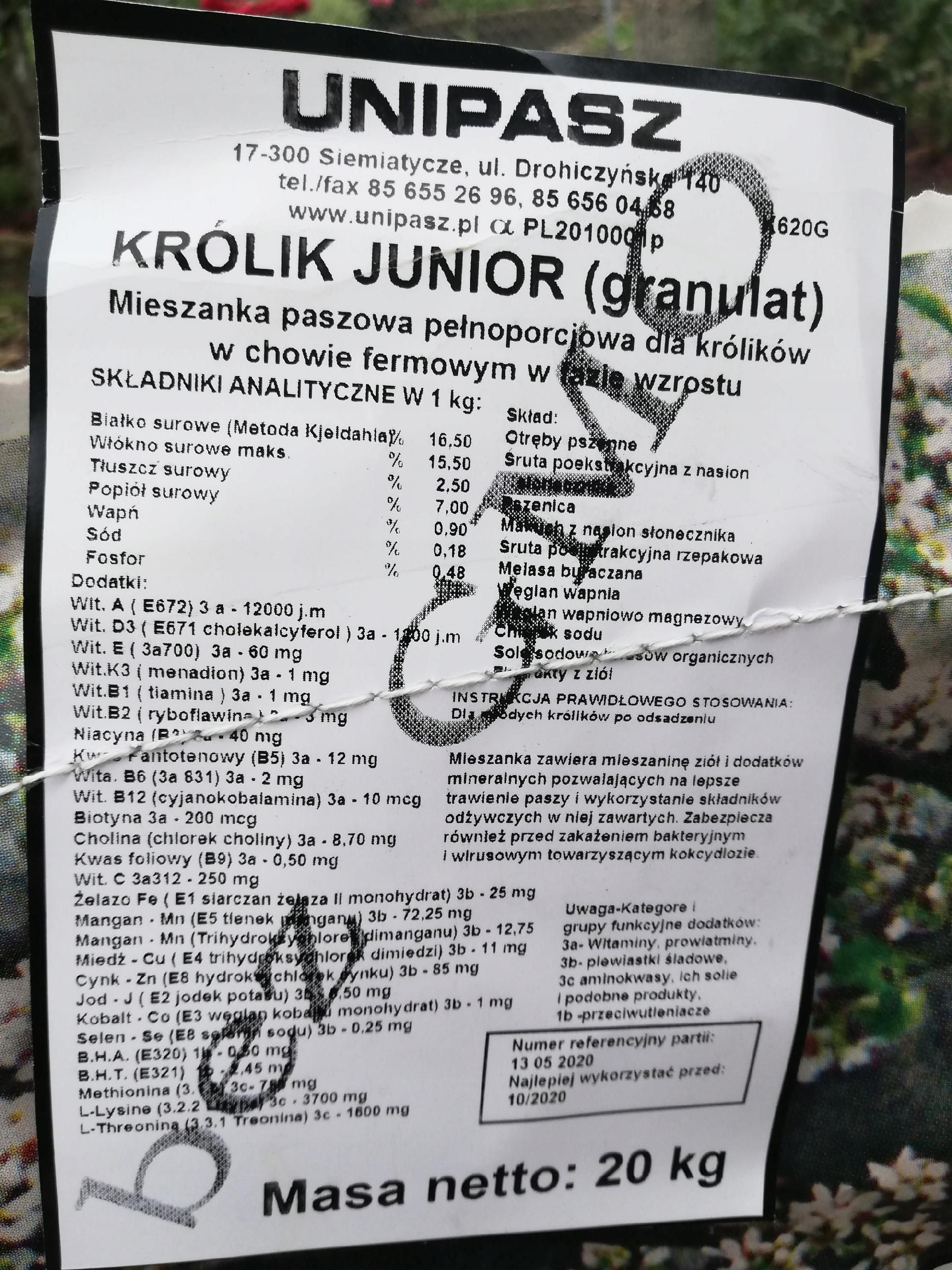 | Kod producenta | Pasza karma Królik junior młode UNIPASZ 20kg |