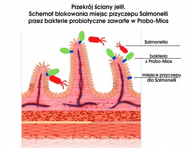 Działa osłonowo przy kuracjach antybiotykowych oraz redukuje wystąpienia chorób bakteryjnych w jelitach wywołanych m.in. przez bakterie Clostridium, E.coli, Salmonella. Zawiera bakterie probiotyczne, które produkują naturalny antybiotyk zwalczający chorobotwórcze bakterie. Dodatkowo zakłóca przekazywanie informacji między bakteriami, co nie pozwala im na uodparnianie się na często stosowane leki. Zastosowane bakterie probiotyczne są na tyle oporne i trwałe, że nie zabije ich nawet żaden antybiotyk, więc można je stosować w czasie podawania leków, aby szybko odbudować florę jelitową. Probo-Mios nie tylko zwalcza biegunkę, ale również leczy stan zapalny dzięki zastosowaniu specjalnej glinki (grey-less) działającej na jelita jak plaster na ranę.
